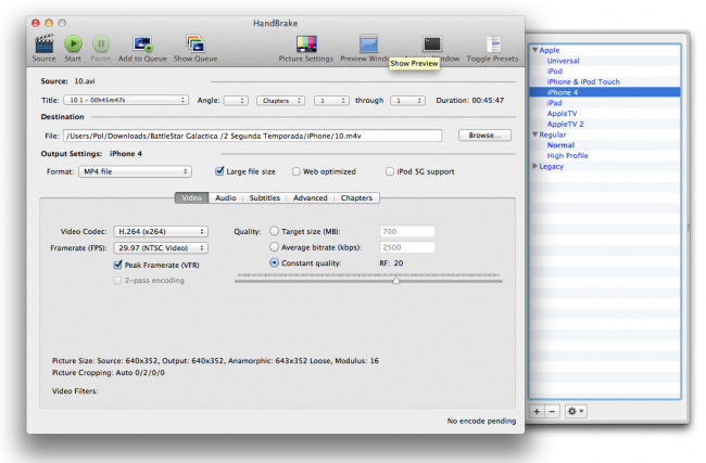 Ahora, en opciones de salida seleccionamos el formato que más nos convenga para nuestro dispositivo, en mi caso iPhone 4